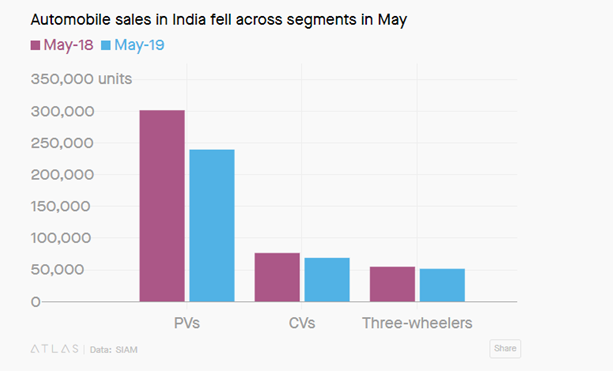 The Indian automotive sector is facing an ominous future in the near term – as recent figures show. In April’19, the Society of Indian Automobile Manufacturers Association (SIAM) announced a 17% decline in passenger vehicle sales – the latter stood at it’s lowest in 8 years. It was the 10th consecutive month of de-growth for a sector that usually stands at the forefront in terms of indicator of good economic health. The situation only went from bad to worse – May 2019 became the worst month since September 2001 in terms of Y-o-Y sales decline.
