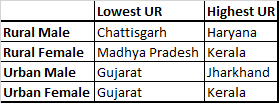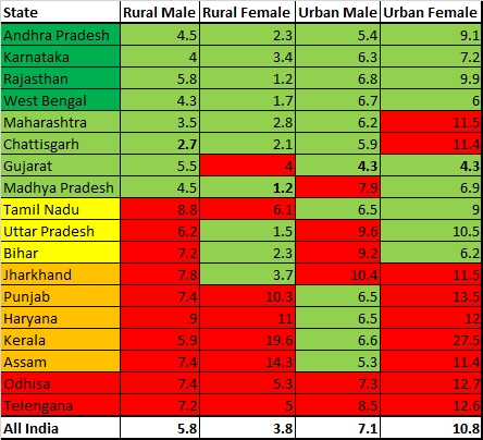 For rural males majority of the states ( 10 out of 18) has unemployment rates above the national average. But the pattern reverses for rural females and urban males where majority of the states has lower unemployment rates compared to the national average. For urban females equal number of states have unemployment rates higher / lower than the national average. Gujarat has the lowest unemployment rates for both urban male and female while Kerala has the highest unemployment rate for females in both urban and rural India among the major states.