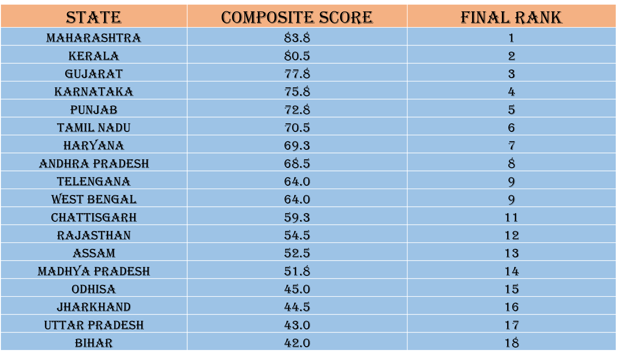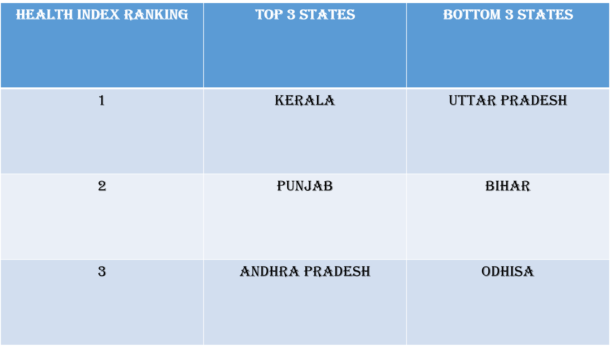 Similar to education, Kerala holds the top position in terms of the Health Index. The erstwhile economically backward states of Uttar Pradesh, Bihar and Odhisa hold the bottom three position.