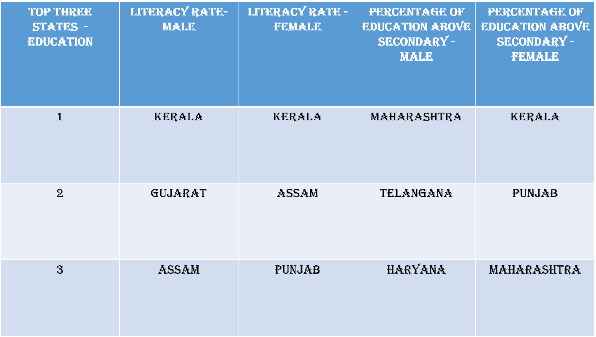 Kerala holds the top spot in three of the four measures of education with Maharashtra topping in terms of percentage of male attaining education above secondary level.