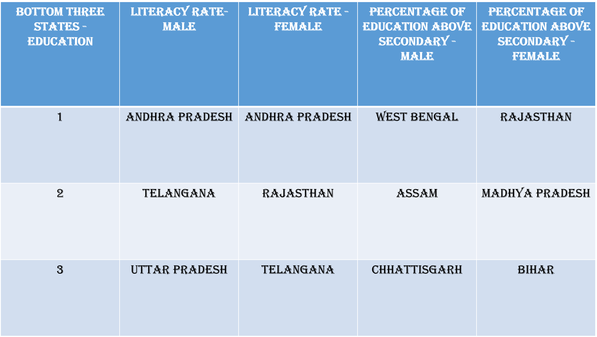 The Annual PLFS report gives the literacy rates for male and female separately across different states of the country. Also the percentage of male and female attaining different levels of education is reported. For the composite index, ranking of states based on literacy rate separately for male and female and the ranking of states based on percentage of people attaining secondary or above education separately for male and female is considered.