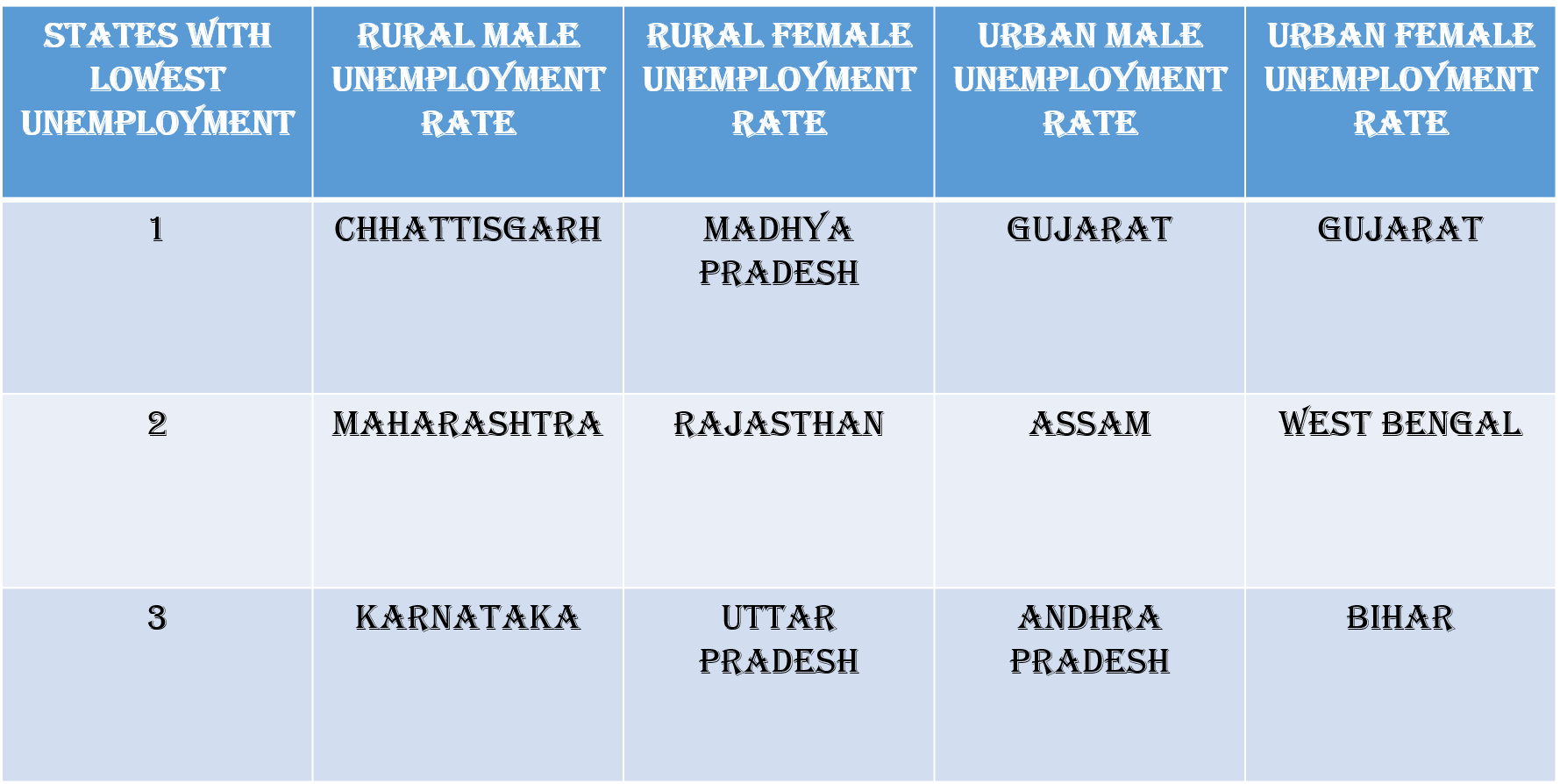 Gujarat has the lowest unemployment rate in urban India for both male and female. Kerala on the other hand has the highest unemployment rate for both rural and urban female. Hatyana, which has the highest per capita NSDP reports to have one of the highest unemployment rate in rural India.