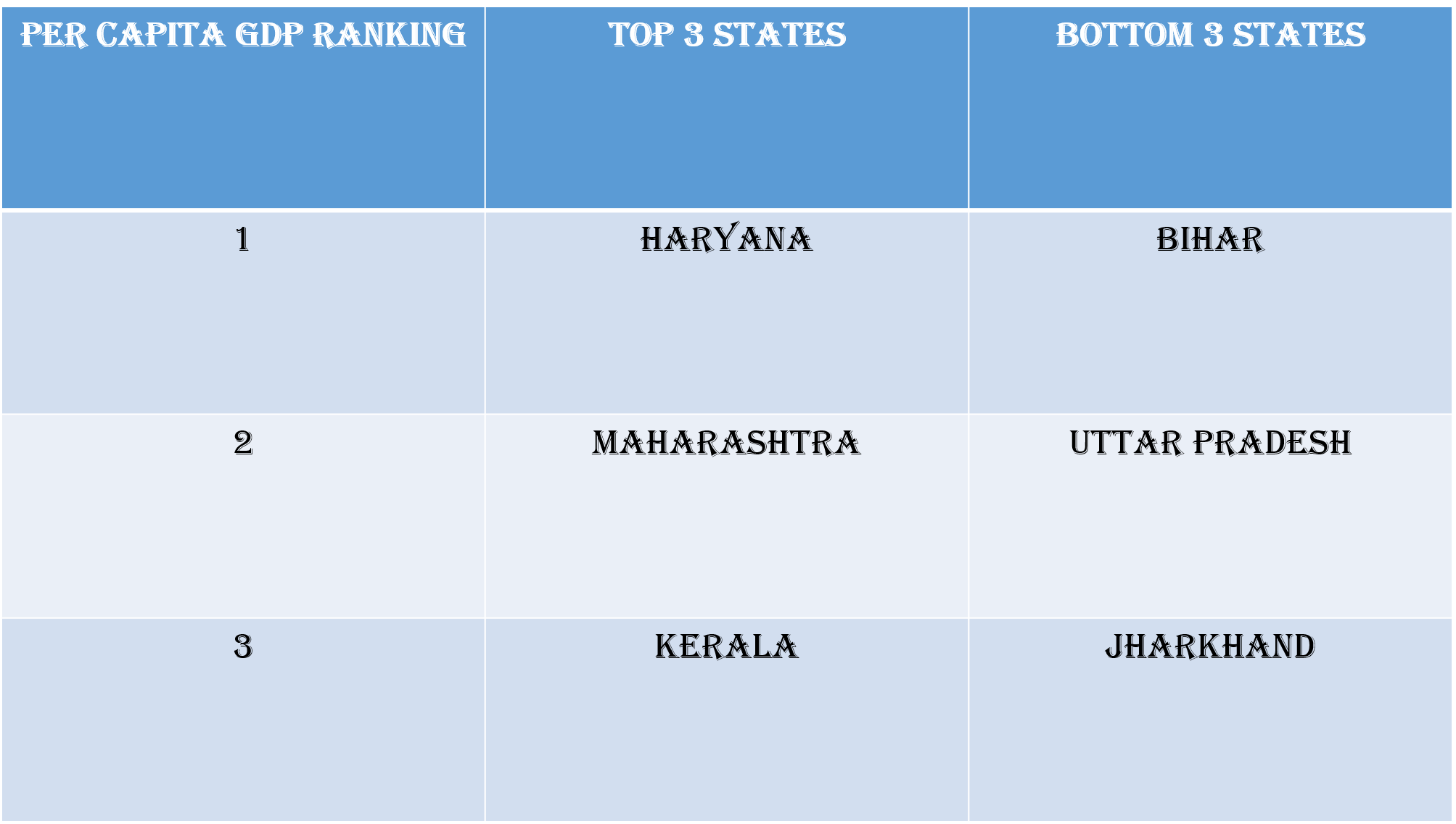 Haryana has the highest per capita GDP among the states followed by Maharashtra and Kerala. It needs to be noted that Kerala hold top position in education and health also. Maharashtra is also among the top states in terms of education and fourth in terms of health. Bihar and Uttar Pradesh have the lowest per capita NSDP among all the states.