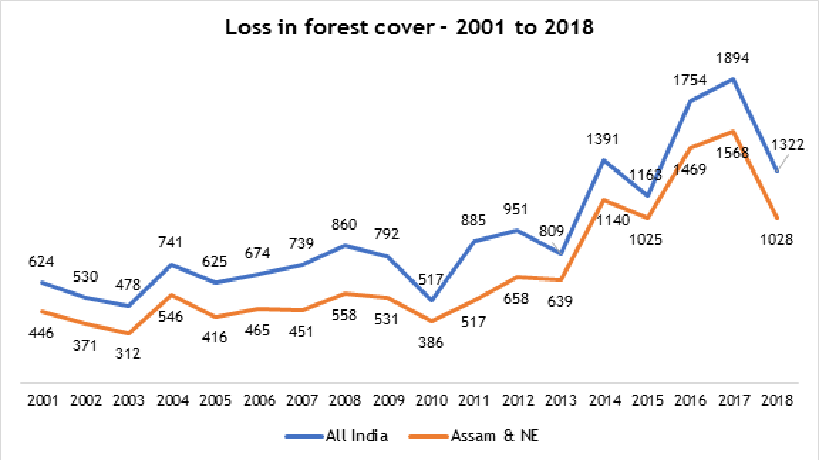 From 2001-2018, maximum loss of forest area has been in Assam – 2388.5 sq. kms while Mizoram has lost the maximum in the last 6 years (1392 sq. km)