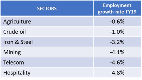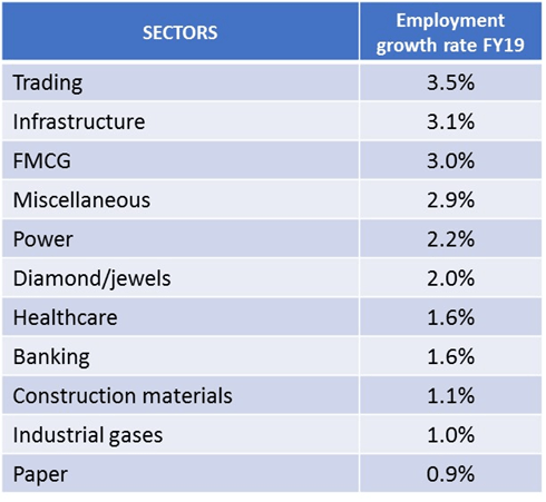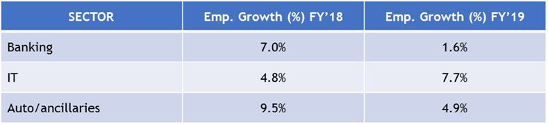 The available data shows that in FY2018 (Apr’18-Mar’19), the total employment no. grew from 5.78 million to 6.03 million, i.e. a growth of 4.3%. This is nearly 2 percentage points less than the growth in employment (6.2%) witnessed in FY2017. During FY 2018, the 3 largest sectors in terms of employment share were Banking (21.0%), IT/ITES (20.4%) and Auto/auto ancillaries (7.4%). What is worrying is that two of the above 3 have witnessed a decline in employment growth rates from FY’17 to FY’18 (exhibit below):