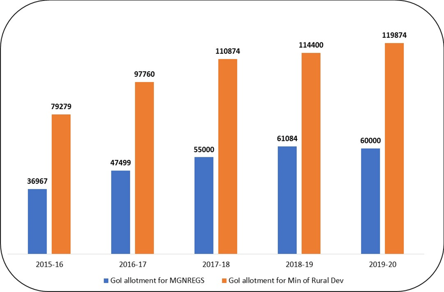 GoI allocation: the union budget 2019 allotted Rs 60,000 crores for the MGNERGS. This was approximately 2% less than the allotment for the previous FY. Although, the overall allotment for the ministry of Rural Development witnesses a 5% increase in the same period.