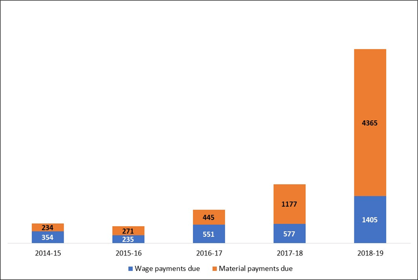 Pending financial liabilities: As MGNREGS is a demand-driven scheme, there are not state wise fixed allocated funds. Release by center to states happens basis labour budget estimates prepared at the start of the FY and actual demand for work during the year. Additional expenditure incurred by states, over and above the funds available to them is known as pending liabilities. This is reimbursed by the GoI. These liabilities have accumulated due to delays in payment of both labor wages as well material costs. From Rs 724 crores in FY’14-15, pending liabilities have increased to Rs 5932 crores as of 31st Dec, 2018, out of which Rs 1405 crores was pending wages.