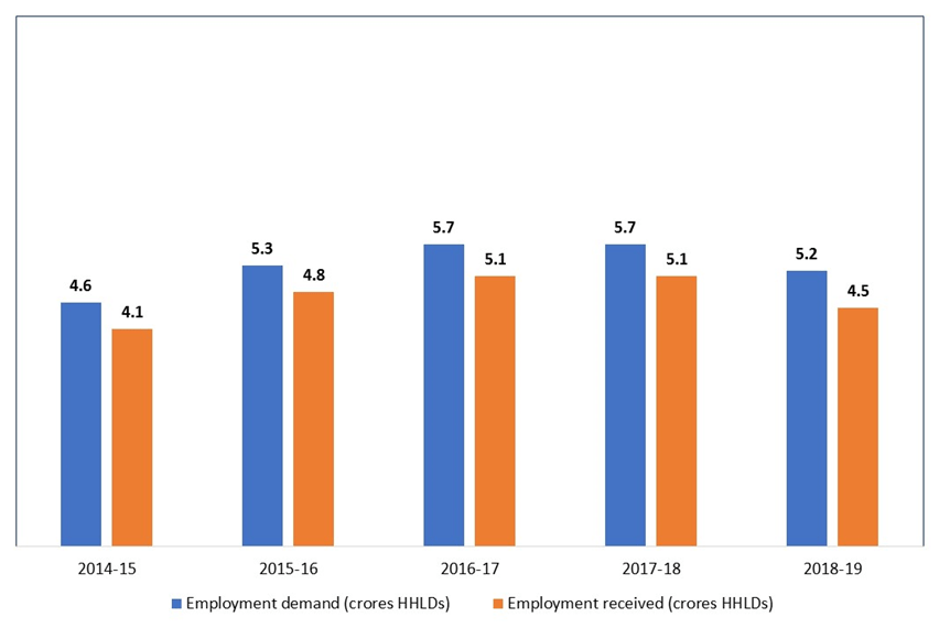 Employment demanded vs provided: On average over the last 5 year period, 89% of employment demand was provided through MGNREGS. On average, 0.5-0.6 crore households were not able to secure jobs in every FY.