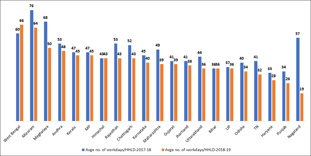 In the year FY’18-19, Mizoram (52%), MP (51%), TN (32%) and Andhra (30%) were the better performing states on work completion rates. The worst performing states were Assam, Kerala, Punjab and Goa where WCR was <5%.