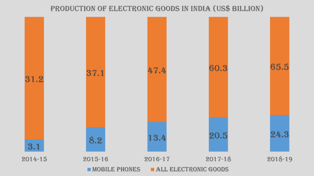 Amid the slowdown in the Indian economy, certain sectors have been performing well. One of the bright spots has been the electronic sector. As per the annual report published by Reserve Bank of India on 29th August, total production of electronic goods in value terms more than doubled from $31.2 billion in FY15 to $65.5 billion in FY19. This was mainly driven by the rise in production of Mobile Phones. India has become the 2nd largest producer of mobile phones, replacing Vietnam.