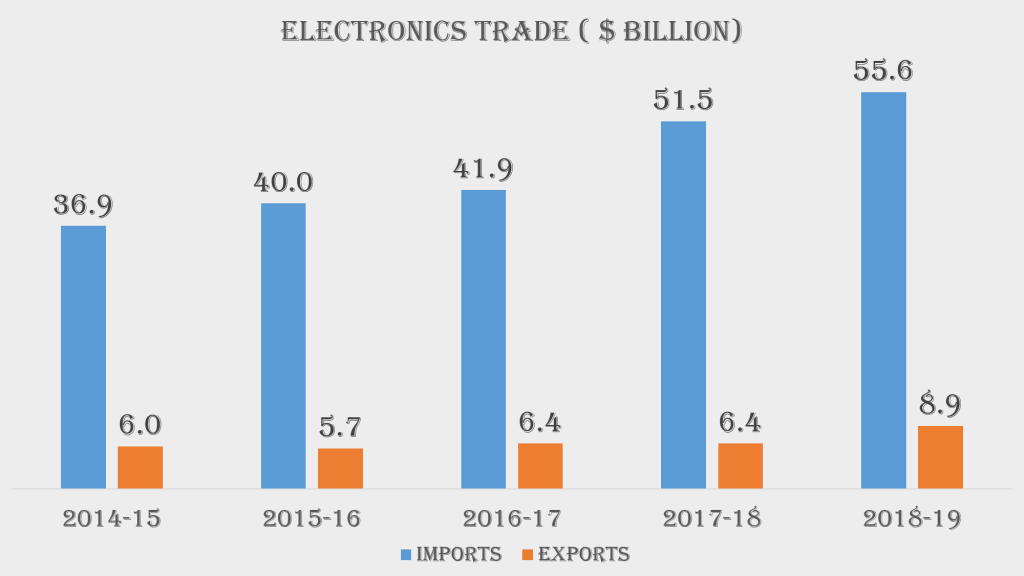 Indian electronic good exports stood as high as $ 8.85 billion as of 2012-13. Since then it has been declining. This was mainly driven by the the damaging impact of the October 2014 shutdown of Nokia’s manufacturing plant in Tamil Nadu. However, the Indian economy has been able to offset the loss in the recent years. One of the reason for the boost in electronic export is the ongoing trade war between China and US.