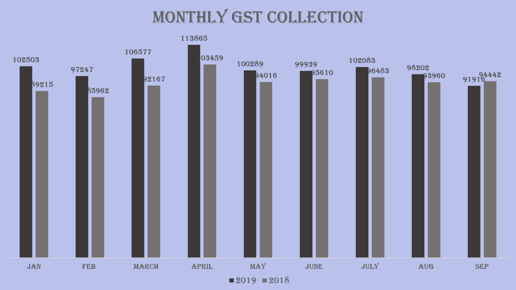 The monthly GST collection in 2019 has been higher than that of 2018 in all months till August, 2019. September, 2019 saw a decline in the GST collection figure with respect to the same month previous year.