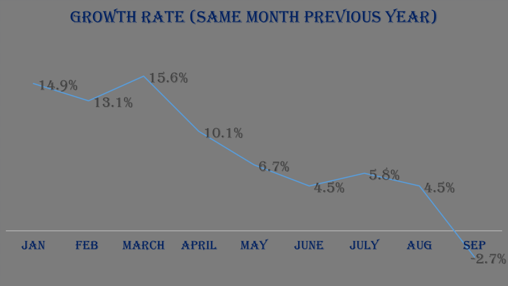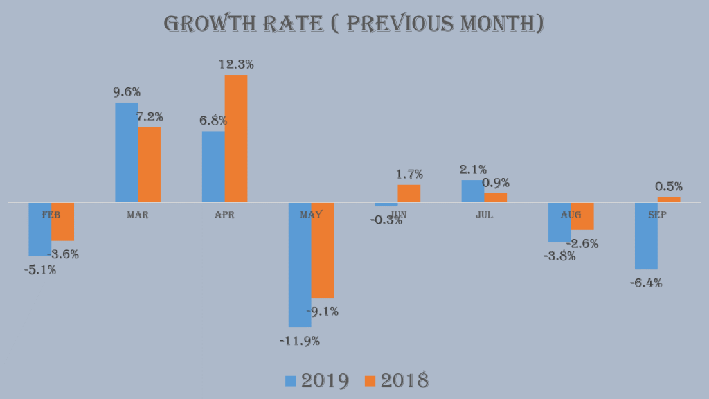 The consistent picture is that for months where there is a negative growth, the severity of decline is more in 2019 in comparison to 2018. Similarly, whenever there is a positive growth, the growth has been less in 2019 in comparison to 2018 with the only exception being the months of March and July. Then there are the months of June and September, where there has been a positive growth in 2018, but in 2019 there has been a negative growth in comparison to the previous month.