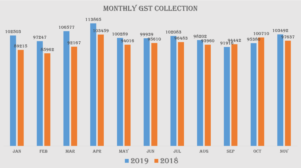 The GST collection for the month of November show a 6% growth from the same month previous year. The total collection was over Rs 1.03 lacks crore. The collection was Rs 97637 crore in November,2018. The collection for October was Rs 95380 crores.