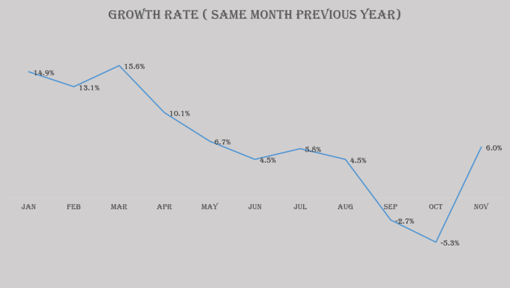 There has been a steady decline in GST growth rate till October. This month marks a reversal to the trend. It must be noted GST collection of November is based on the economic activity of October, which was a festive month. Even the car sales which witnessed a steady decline, showed some positive trend.