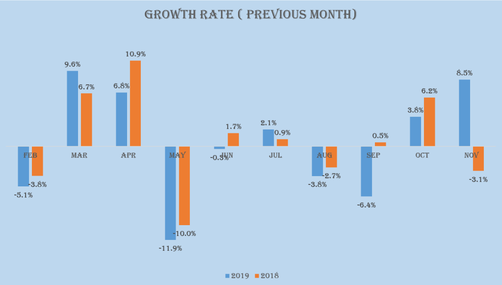 The month on month trend also showed a positive movement in November. There is over 8% growth with respect to October, 2019.