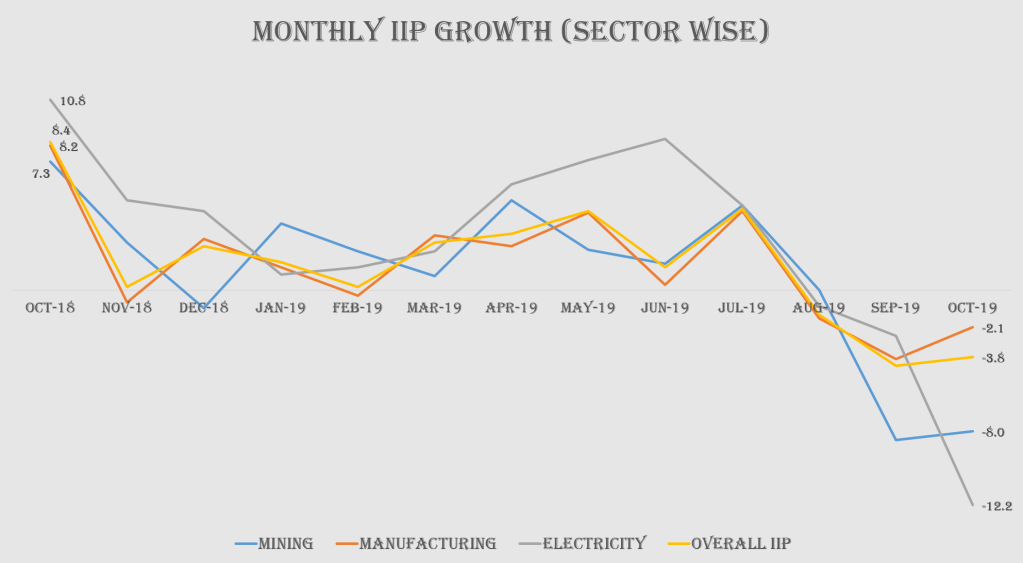 The IIP numbers for October, 2019 stands to be the lowest when compared for the same month over the years. One of the reasons for this remains the demand slump. The Q2, growth numbers clearly showed a slump in the private consumption growth rate. Moreover there has been a decline in exports also leading to a further slump. The contraction in consumer durables deepened in October. Production of items such as cars and household appliances contracted 18% in October, after shrinking 9.9% in the month before. Capital goods production that reflects investments in manufacturing continued its sharp contraction and stood at -21.9%.