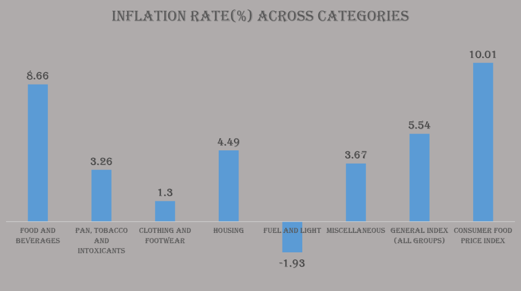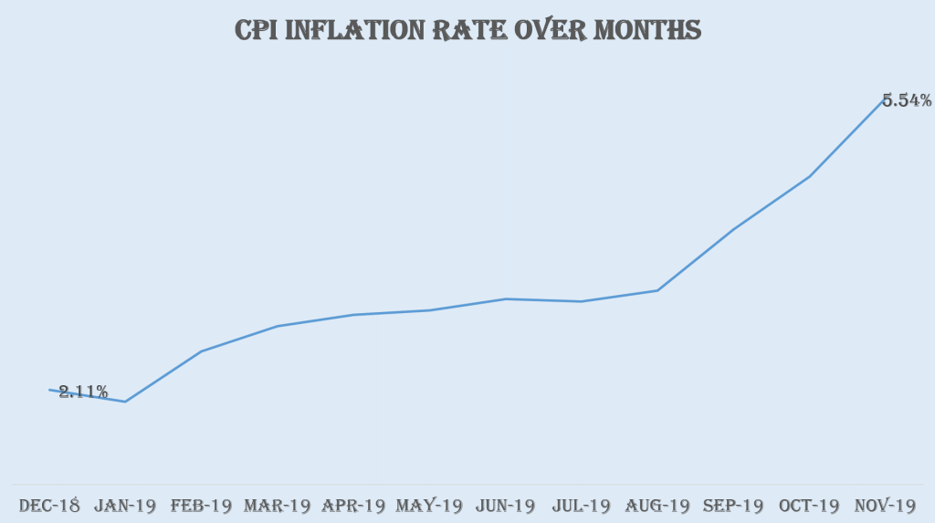 The CPI based inflation rate which stood at 2.11% in the month of December,2018 has been seeing a steady increase and is now at 5.54% in the month of November,2019. The rate of increase of inflation rate has been severe since the month of August, 2019. This rise in inflation rate is majorly dominated by the food inflation. The consumer food price index (cost of a typical food basket) based inflation stood at 10.01%. The Food & Beverages has the highest inflation rate among all other categories.