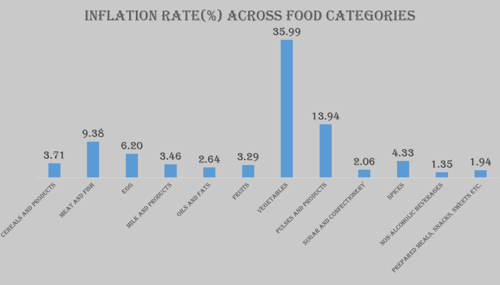 This rise in food inflation is driven by the unusual rains which affected the output of vegetables. In a typical Indian household, for vegetarians, the necessary food basket consists of cereals, vegetables and pulses. For a non vegetarian on the other hand, the necessary food consists of meat, fish and egg along with cereals and vegetables. The vegetable inflation stood at a whopping high of 36% while the inflation for pulses was as high as 14%. The meat and fish inflation stood at 9.2%. Among the necessary items in the food basket of a typical Indian family, only cereals had a lower inflation rate compared to the others. So a typical Indian household, both vegetarian and non vegetarian, has to spend more considerably to maintain the necessary food basket or has to reduce consumption.