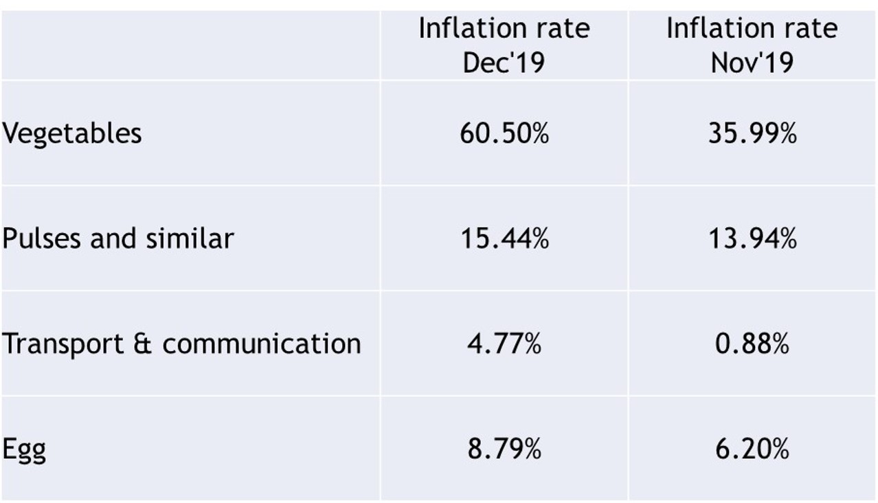 Food inflation as a whole increased to 14.12% in Dec’19 from 10.01% in the previous month. Food inflation had stood at (-)2.65% in Dec’18. Increase in vegetable prices was the main factor behind the sharp increase in food inflation – refer image below.