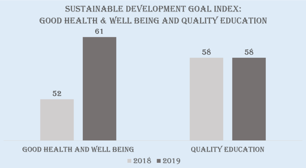 In terms of the SDG 3 index on health, there has been an improvement in the performance at an all India level with the index value showing a 9 point increasein 2019 as compared to 2018. In terms of SDG 4 index on education, there is no change in the index value at an all India level in 2019 and 2018.