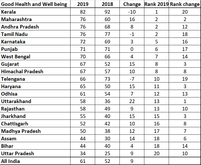 Kerala, Maharashtra, Andhra Pradesh and Tamil Nadu are the top performing states in terms of health index while Uttar Pradesh, Bihar and Assam are the bottom ranked states. In terms of improvement of index in 2019 as compared to 2018, it has been seen apart from 3 states, all the other states have shown considerable improvement. There has been considerable improvement for the low ranked states. The decline in index value is noted for few of the high ranked states, the major being the top ranked state of Kerala. However Kerala still has a very high value.