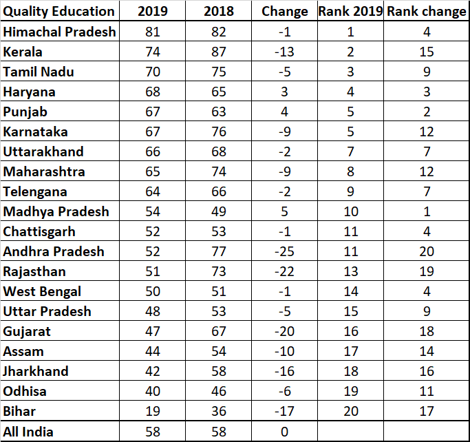 Himachal Pradesh, Kerala and Tamil Nadu are the top three ranked states in terms of SDG 4: ‘quality of education’ while Bihar, Odhisa and Jharkhand are the three bottom ranked states in 2019. In terms of change in performance with respect to 2018, it is seen that apart from 3 states ( Madhya Pradesh, Punjab and Haryana), all the other states has shown a decline in the index in 2019 as compared to the last year. Moreover, the low ranked states also witness a significant decline in the performance in 2019 as compared to 2018. The decline in the performance in low ranked states has been severe.