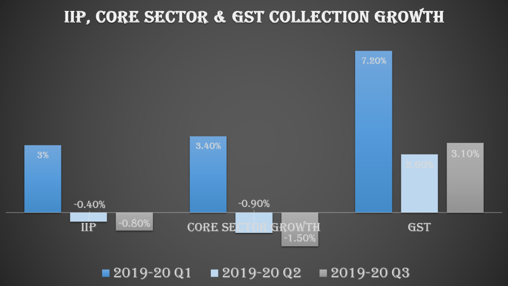 The IIP and the core sector growth numbers showed a steady decline since the first quarter of FY, 2019-20. The decline has been must sharper in Q2 as compared to Q1. The negative trend continued in Q3. There has been a sharper decline in GST collection in Q2, FY 19-20 as compared to Q1 for GST collection growth. The same has seen a marginal increase in Q3. One reason for the increase in GST collection is the step taken by government to cap the input tax credit to 20% to control for revenue leakage. This was announced in October. This might also be suggestive of some surge in demand which saw a sharp decline in the previous quarters.