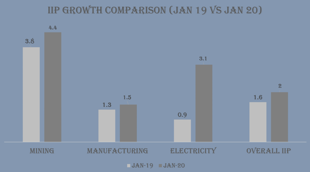 After a negative growth in the previous month, the IIP growth recovered to 2.0% in January, 2020. It should be noted here the core sector growth also showed a positive trend in January, 2020. So overall there is a sign of revival of the economy. With the threat of Corona virus looming in the entire world economy it needs to be seen whether this sustains over time. In comparison with the same month last year, there is a substantial increase in the IIP for electricity. Mining and manufacturing also showed some increase in the growth rate as compared to the same month previous year.