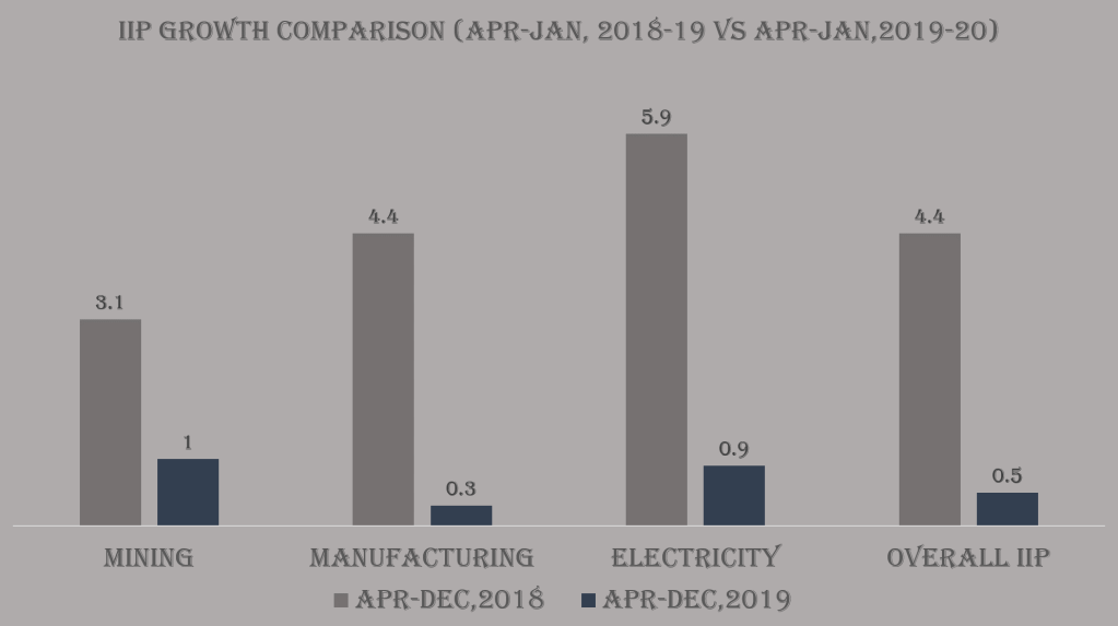 The comparison of Apr-Jan, 2019-20 with the same in the previous financial year shows a dismal picture because of the slowdown that had impacted the economy since the last quarter of previous financial year. The April-Jan, 2019-20 numbers for IIP stood at 0.5% as against 4.4% in the same time in the previous financial year. Similar drop in growth is evident across all the three sectors, viz, mining, manufacturing and electricity.