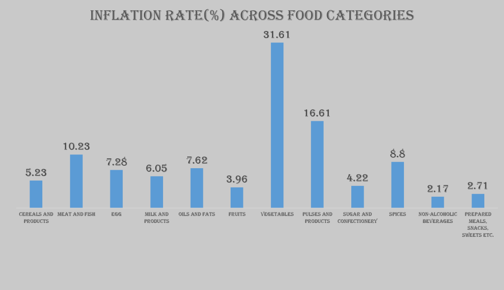 The inflation rate is highest for the food and beverages category which means that the impact of this rising inflation is all across the population across income strata. Food price index is as high as 10.81%.