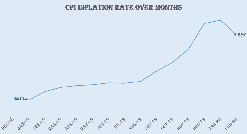 The retail inflation rate as of February, 2020 stood at 6.58% as against 2.57% in the same month previous year. However this is lower than the inflation rate of the previous month. The inflation rate has been showing an increase trend since January, 2019. This is the first time in over 13 months, that we see a reverse trend. However the present rate of 6.58% is higher than the permissible range of inflation prescribed by RBI. So while inflation rate has declined with respect to the previous month, it is still at a very high range. It needs to be noted here that as per the budget, 2020-21, the nominal GDP growth is predicted to be at 10% for 2020-21. With over 6.5% inflation rate, this would mean that real GDP growth will translate into less than 4%. Moreover higher inflation in a time when the economy is facing a demand crunch proves to be more detrimental.
