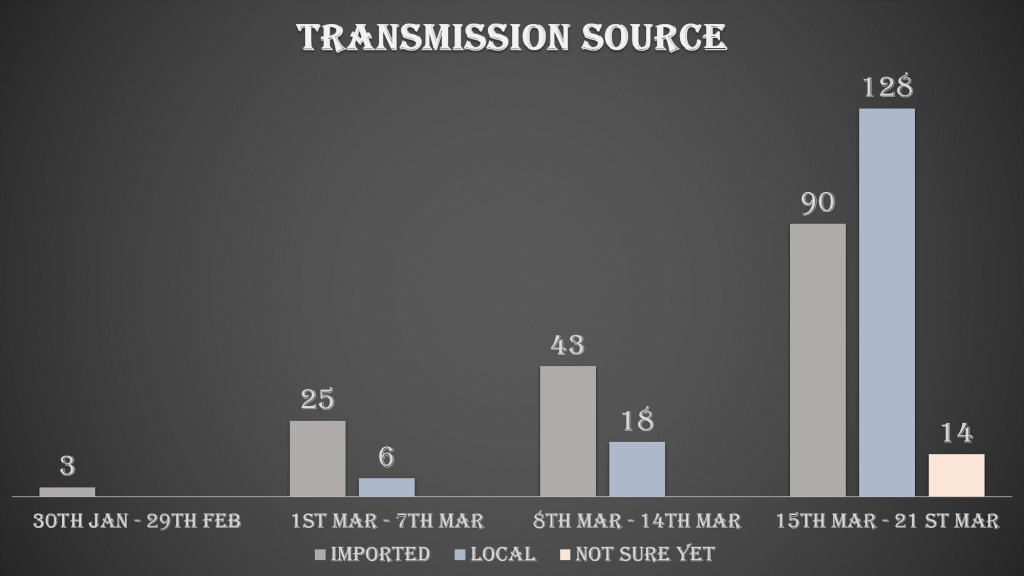 As reflected in the above table the spread has been severe in the 3rd week of March. The spread of this virus has 4 stages. This is determined through transmission sources.