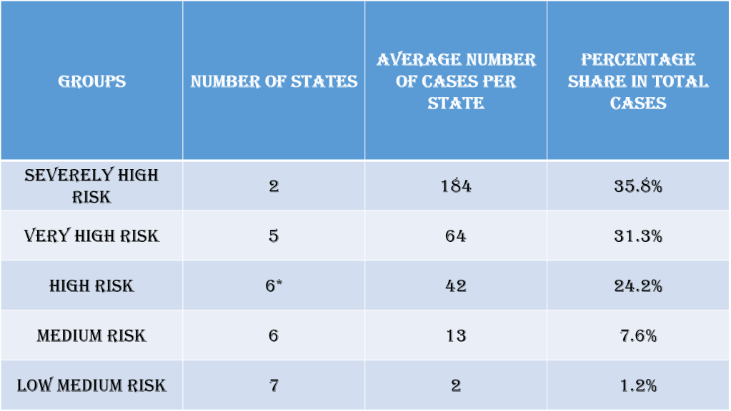 The states in this group stand exactly were the states in the severely high risk group was last week and hence there is a huge risk of some of this states like Karnataka moving into the severely high risk group. Karnataka had a 326% increase in the number of cases this week.