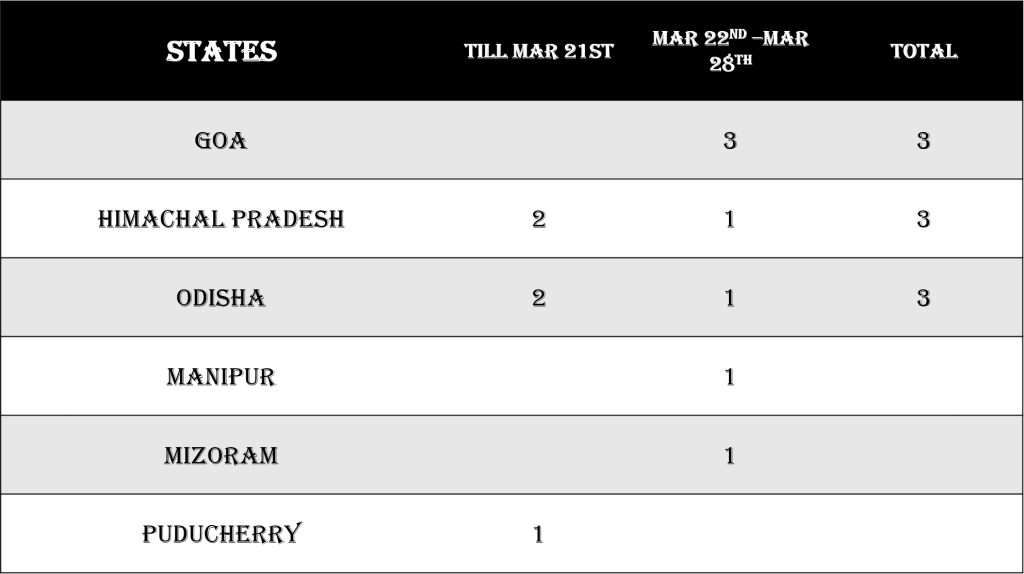 North Eastern states of India had not seen any cases of covid till last week. Manipur and Mizoram saw 1 cases each this week.