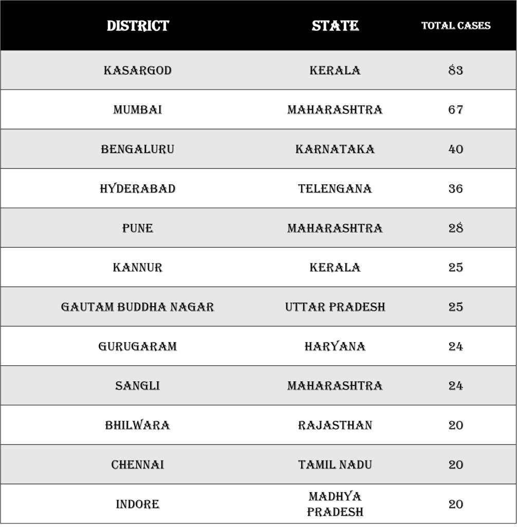 Twelve districts have 20 or more cases of Covid till now. Kasargod in Kerala and Mumbai in Maharashtra are the most affected districts.