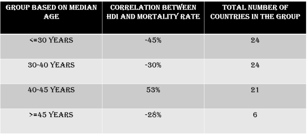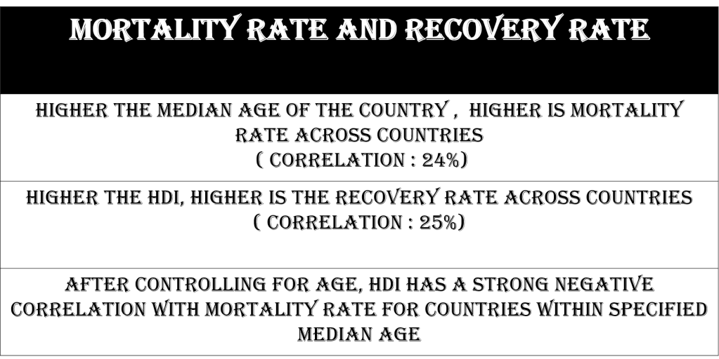 In the context of Indian states it was seen that higher the HDI of the state lower is the mortality rate of the state. HDI is seen have a high correlation with recovery rate for the top 75 countries in the world. In terms of mortality rate, we see that the impact of HDI on mortality rate varied across median age groups.
