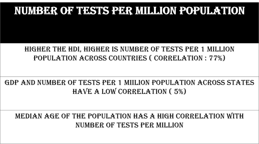 It is seen that higher the Human development Index of the country, higher is the number of tests per million population in that country. Similar trend has been seen in case of Indian states also. GDP on the other hand has a very low correlation with number of tests conducted per one million population. Higher HDI in a way means better health outcome suggesting of better health infrastructure available in the country. Better the health infrastructure higher is the capability of conducting more tests.