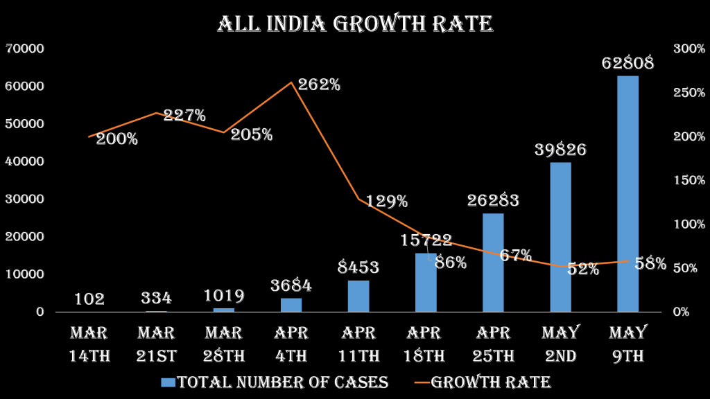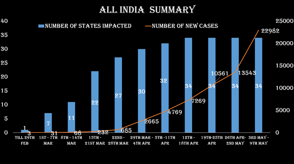 There are over 22982 new cases in the week of 3rd May to 9th May with 34 states and Union territories impacted all across the country. The weekly growth rate also increased for the first time since the week of 4th April. There has been a 58% increase in the total number of cases in the week as against 52% in the previous week. During this week there has been a 59% increase in the total number of deaths from 1323 in the week ending on 2nd May to 2101 in the week ending on 9th May.