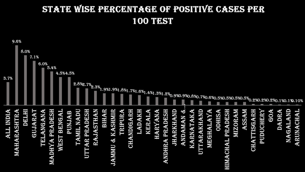 Maharashtra, Delhi and Gujarat has the highest number of positive cases per 100 tests conducted while there are 16 states with less than 1% positive cases out of the total number of tests conducted in those states. There are 6 states which have higher percentage of positive cases per 100 states than the national average of 3.7%. More tests needs to be conducted in states with higher percentage of positive cases.