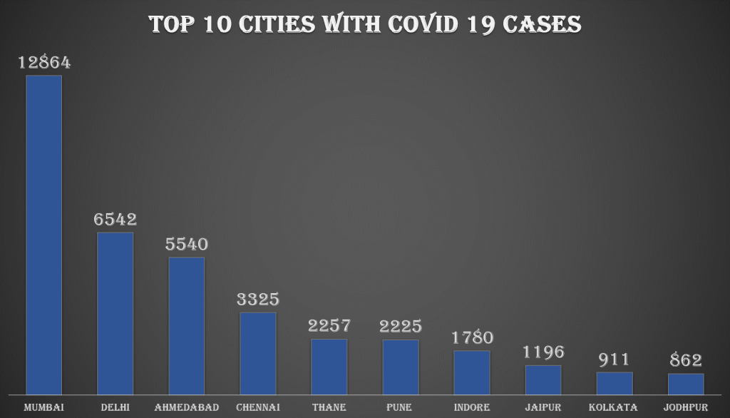 Over 59% of all the cases in the country comes from 10 cities in the country. Another 9.2% comes from the next 10 cities. So only 20 cities put together contribute to 69% of all the cases in the country. Mumbai, the financial capital of the country alone accounts for over 20% of the total number of cases in the country. In the top 10 cities there are three cities from Maharashtra ( Mumbai, Pune and Thane), two cities from Rajasthan ( Jaipur and Jodhpur) and one city each from Gujarat ( Ahmedabad) Madhya Pradesh (Indore), West Bengal (Kolkata) and Tamil Nadu (Chennai) respectively. The national capital region of Delhi also falls in the top 10 cities. Surat which one among the top 10 cities last week moved out of the top 10. Kolkata from West Bengal is the new entrant in the top 10. Utmost focus in required in these cities to control the spread of the virus.