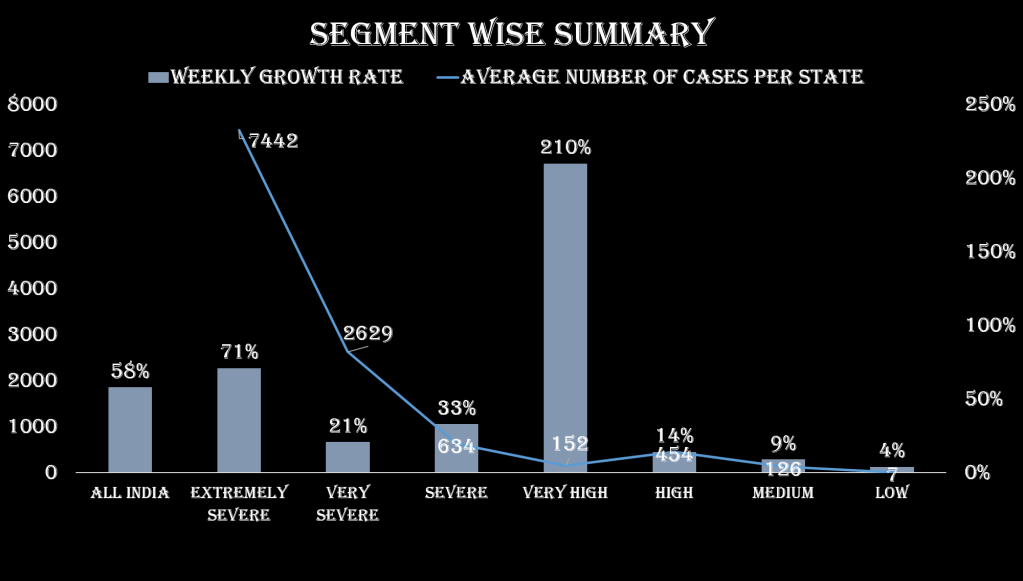 States like West Bengal and Punjab moved into extremely severe risk segment while Andhra Pradesh moved out of the extremely severe segment. Haryana, Odhisa, Chandigarh, Tripura and Himachal Pradesh are the other states and UTs which moved into higher risk segments. Goa and 5 north east Indian states show no new cases this week. Kerala and Telangana showed less than 10% growth rate in new cases. It is commendable for both as Kerala was the top most state few weeks back and Telangana was also in the severe risk segments. The highest growth rate was of Tripura as it rose from 4 cases till last week to 135 cases at the end of this week. Segment wise trends are reflected by the following graphs.