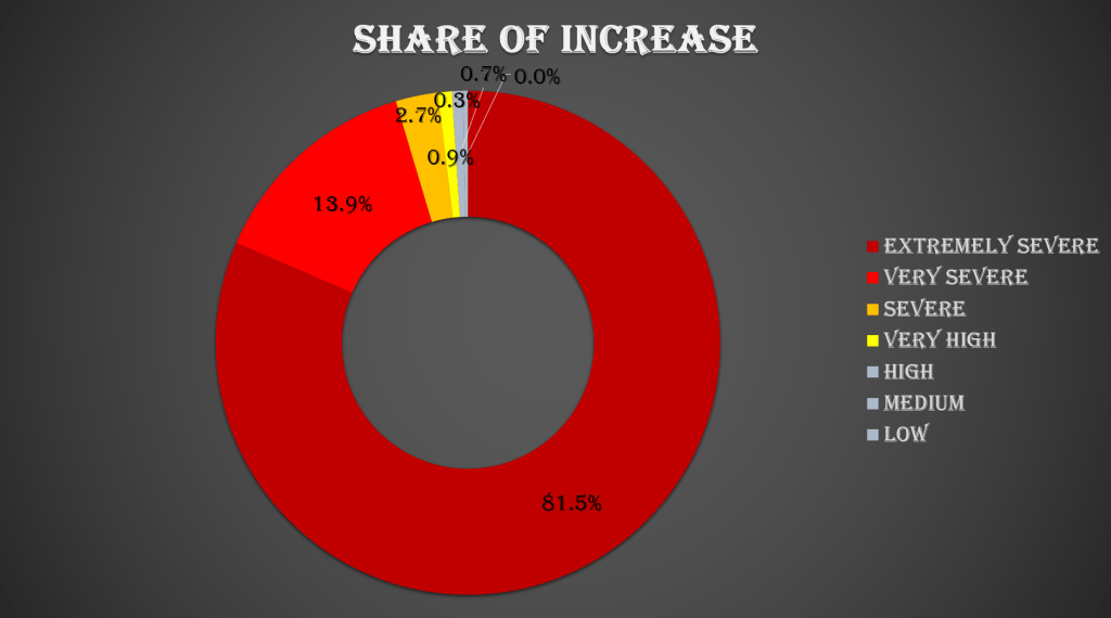 The extremely severe risk group show a 71% increase in the number of cases. All other risk groups have lower growth rate than the national growth rate apart from the very high segment which show a massive increase mainly because of Tripura. There has been no new cases in 8 of low risk group states and UTs. The extremely severe group has lion’s share in the new cases this week with over 82% of the new cases coming from this group followed by the very severe risk group. The share of new cases across segments falls as the risk of the segment falls.