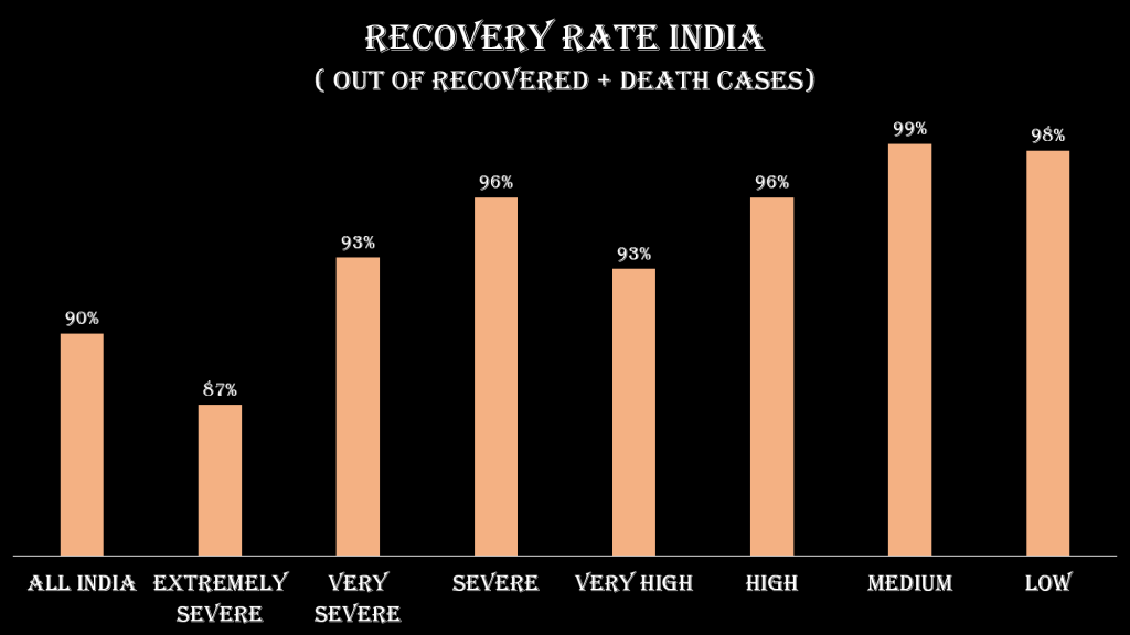 Moreover in terms of recovery rate, the extremely severe risk group has a lower recovery rate compared to the other risk groups. India overall has a better recovery rate than the world recovery rate of 84%.
