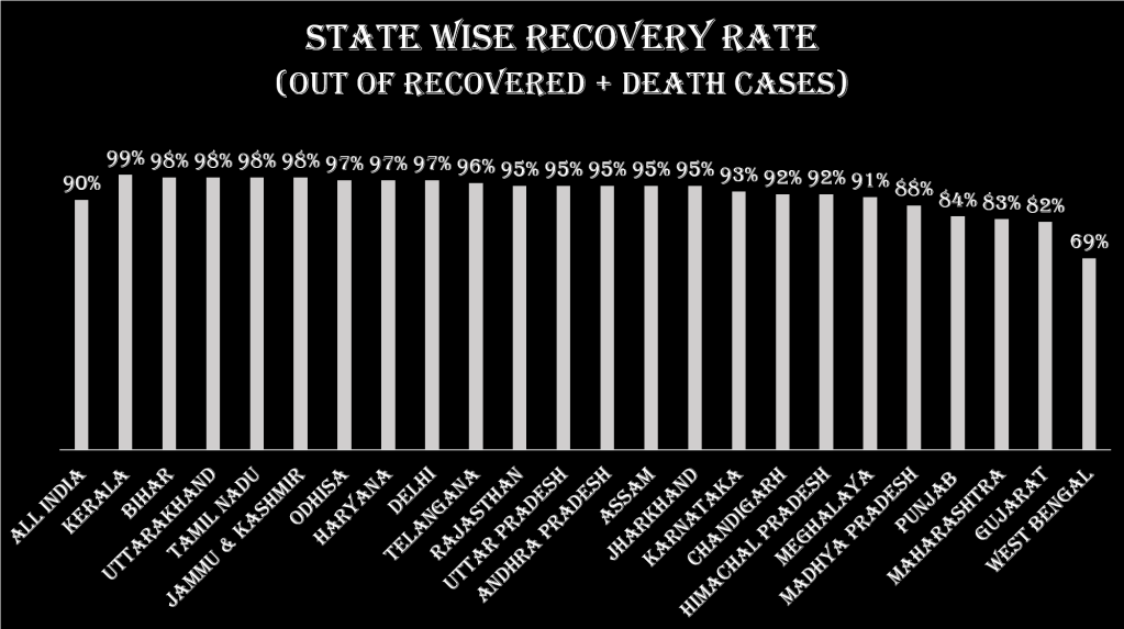 Kerala, Haryana and Tamil Nadu has been the leading states in terms of recovery rate. West Bangal has the lowest recovery rate among all the states and UTs. It has shown a sharp decline from 74% last week to 69% this week. Maharashtra and Gujarat, which are the top two states in terms of the total number of cases, has low recovery rates and are the bottom three states in terms of recovery rate. One silver lining is these two states have shown some improvement in recovery rate as compared to last week.