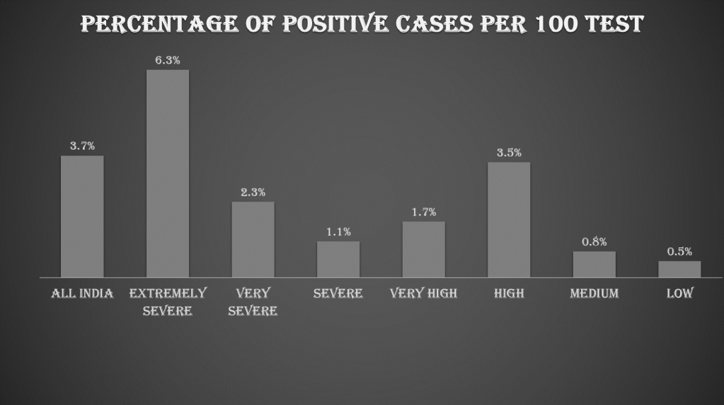 In terms of total number of positive cases per 100 tests conducted, it is seen that the percentage is significantly higher in the extremely severe risk group as compared to the others. This reflects the need to conduct more tests in the higher risk groups as more positive cases are coming from these groups.