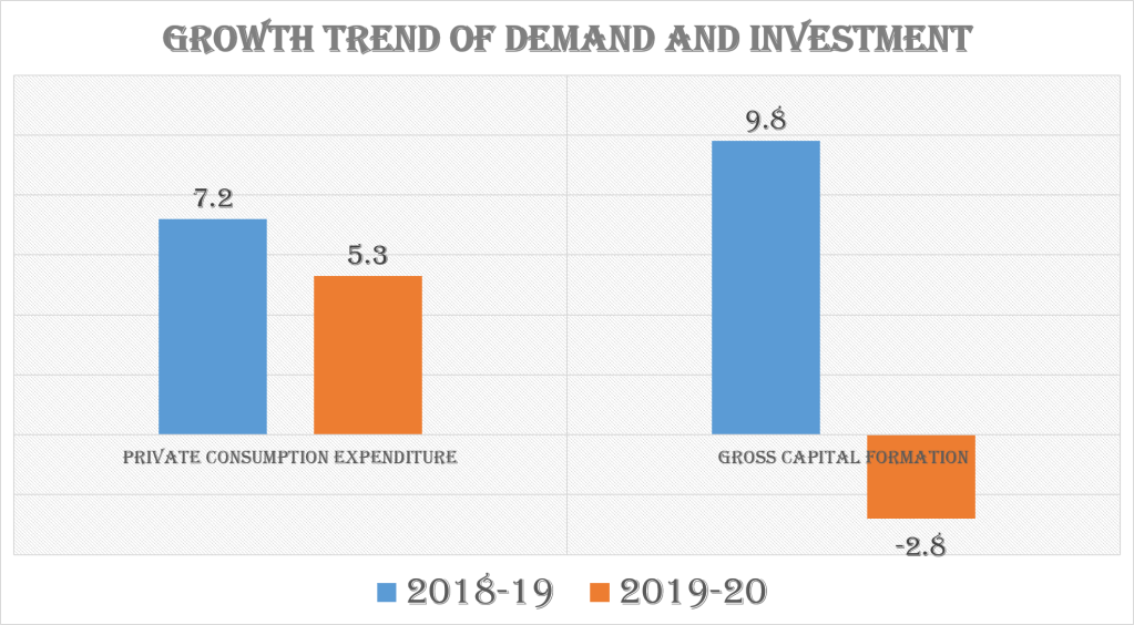 There has been a steady decline in growth rate of demand from 2016-17 onwards. From over 8% in 2015-16, the growth rate of demand has fallen to 5.3% in FY 19-20. The export demand also showed a sharp fall in FY 2019-20. This year there has been a sharp fall in investment growth and we witnessed a shrinking of investment. Now what explains the fall in growth of both demand and investment.