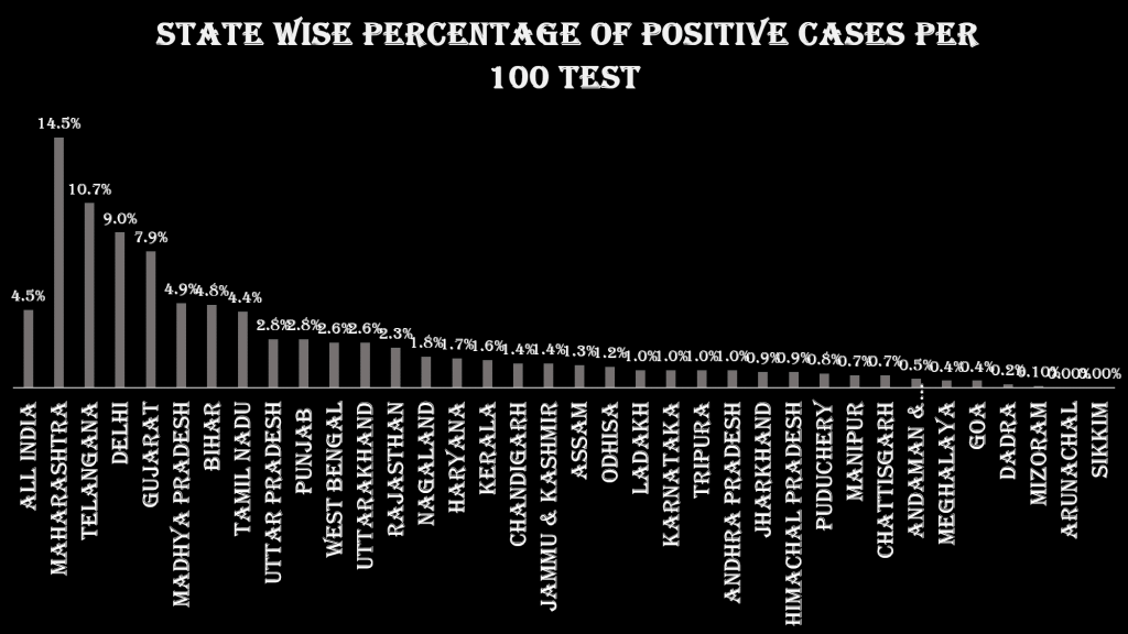 Maharashtra, Telangana and Delhi has the highest number of positive cases per 100 tests conducted while there are 16 states with less than 1% positive cases out of the total number of tests conducted in those states. There are 6 states which have higher percentage of positive cases per 100 states than the national average of 4.5%. Maharashtra and Telangana has seen a significant increase in percentage of positive cases per 100 test this week as compared to the previous week. This has lead to the rise in national rate.