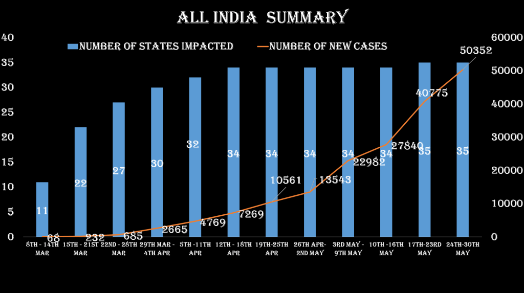 There are over 50352 new cases in the week of 23rd to 30th May with 35 states and Union territories impacted all across the country. The weekly growth rate remained same as compared to last week. There has been a 38% increase in the total number of cases in the week. During this week there has been a 34% increase in the total number of deaths from 3868 in the week ending on 16th May to 5165 in the week ending on 23rd May.