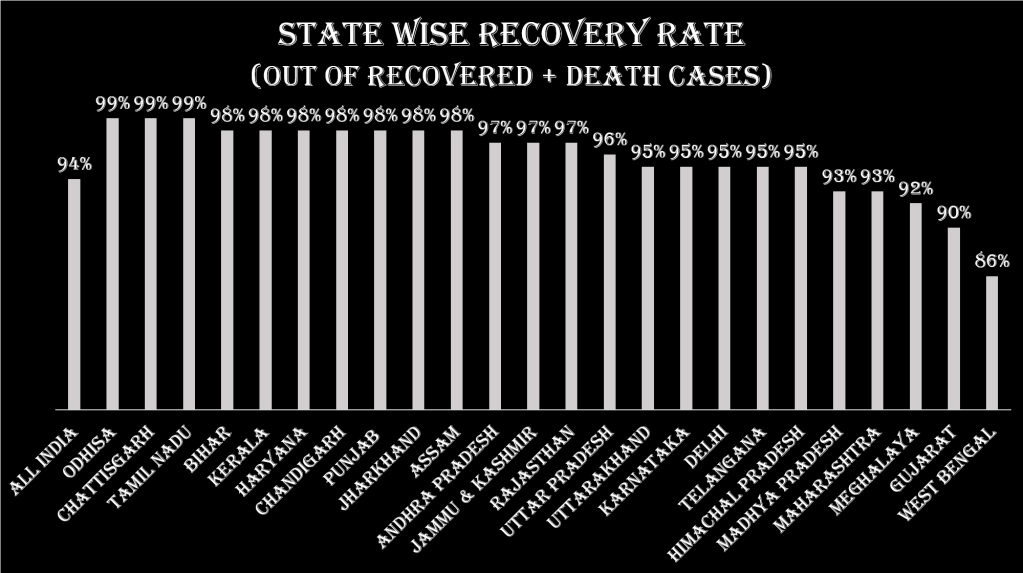 Odisha, Chhattisgarh, Tamilnadu, Bihar and Kerala has been the leading states in terms of recovery rate. West Bangal has the lowest recovery rate among all the states and UTs. Maharashtra and Gujarat, which are among the top states in terms of the total number of cases, has low recovery rates and are the bottom four states in terms of recovery rate. One silver lining is that all these three states have shown some improvement in recovery rate as compared to last week. West Bengal is the only state in India where the recovery rate is less than the world average. All other states have recovery rate more than 88%, which is the world average.